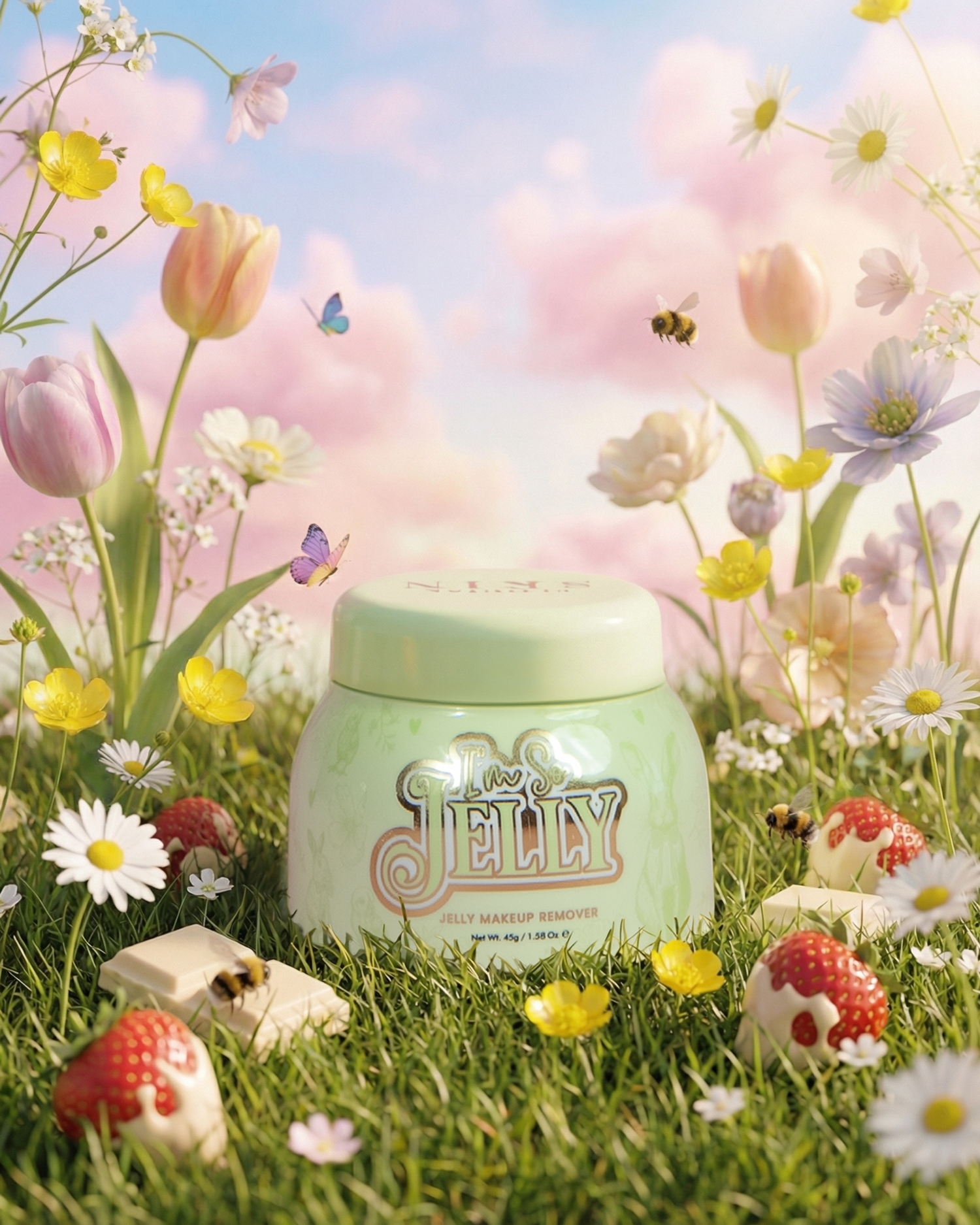 Strawberry Snowflake: Strawberry Snowflake jelly makeup remover:AQUA(WATER),ETHYLHEXYL PALMITATE,BUTYLENE GLYCOL,PEG-8,GLYCERIN,HELIANTHUS ANNUUS (SUNFLOWER) SEED OIL,CAPRYLIC/CAPRIC TRIGLYCERIDE,PEG-240/HDI COPOLYMER BIS-DECYLTETRADECETH-20 ETHER,POLOXAMER 184,POLYSORBATE 60,SORBITAN STEARATE,AROMA(FLAVOR),PEG-100 STEARATE,GLYCERYL STEARATE,HYDROXYACETOPHENONE,SODIUM BENZOATE,PHENOXYETHANOL,CARBOMER,AMINOMETHYL PROPANOL,PANDANUS AMARYLLIFOLIUS LEAF EXTRACT,TOCOPHEROL,POTASSIUM LAURATE,1,2-HEXANEDIOL,FOMES OFFICINALIS (MUSHROOM) EXTRACT,SOPHORA FLAVESCENS ROOT EXTRACT,SCUTELLARIA BAICALENSIS ROOT EXTRACT,SALIX ALBA (WILLOW) BARK EXTRACT,GLYCYRRHIZA INFLATA ROOT EXTRACT,VIOLA TRICOLOR EXTRACT,ROYAL JELLY,CI 16035(RED 40)